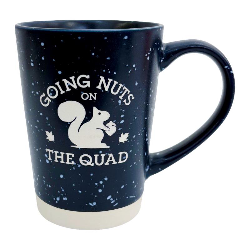 R.F.S.J.® 16oz. Illinois squirrel mug. Start your day with a touch of campus humor! This navy speckled ceramic mug features a laser-engraved playful squirrel graphic and the phrase “Going Nuts on the Quad”, making it the perfect companion for coffee, tea, or any favorite beverage, especially if you're taking this to the Quad. This mug brings a little Illini spirit and a lot of personality to your drinkware collection.