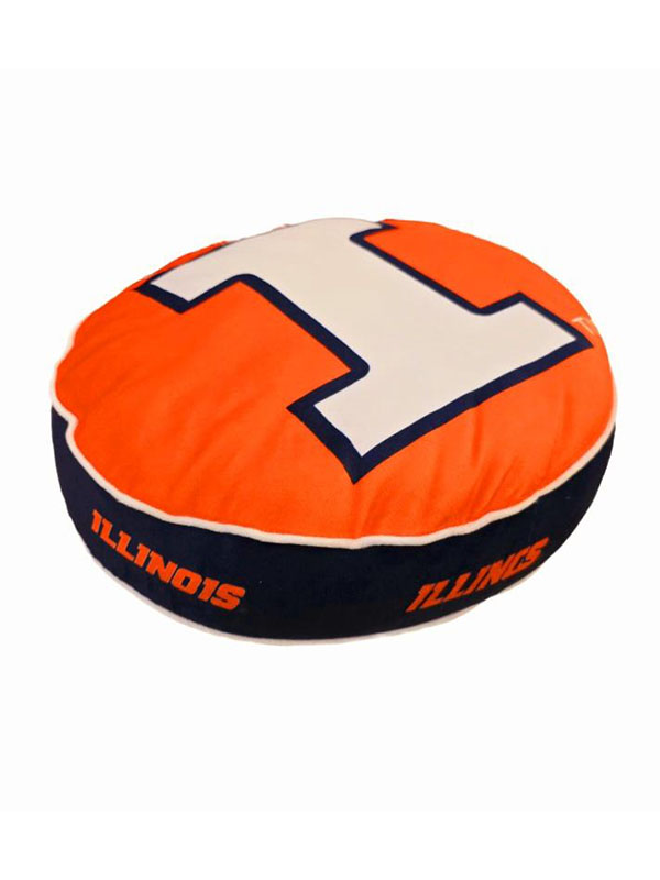 LogoBrands® 15"x15"x4" 100% polyester round pillow. Show off your Fighting Illini pride with this vibrant University of Illinois round puffy pillow! Featuring the iconic orange and navy color scheme, this pillow is designed with a bold white Block I logo prominently displayed on the top and bottom. The sides are accented with the word “ILLINOIS” in orange lettering against a navy background, adding extra team spirit from every angle.