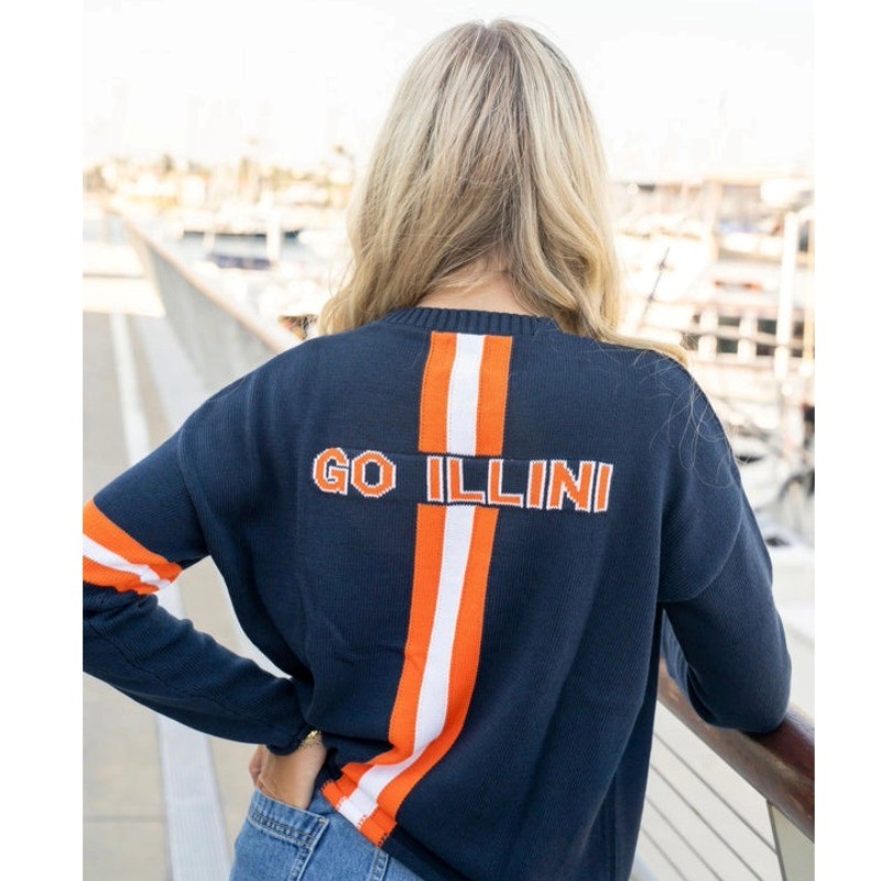 Newport Knits® 100% cotton Illinois women's sweater. Show your Illini pride in timeless style with this bold, retro-inspired knit sweater. With very soft knitting made especially for comfort, this sweater has our classic Block I on the front. “GO ILLINI” is on the back with a striking striped pattern down the center for that extra collegiate look. Matching stripes on the left sleeve add that sporty asymmetrical touch. Ideal for game days, alumni events, or everyday wear, this sweater is a must-have for any true Illinois fan. As it says, Go Illini!