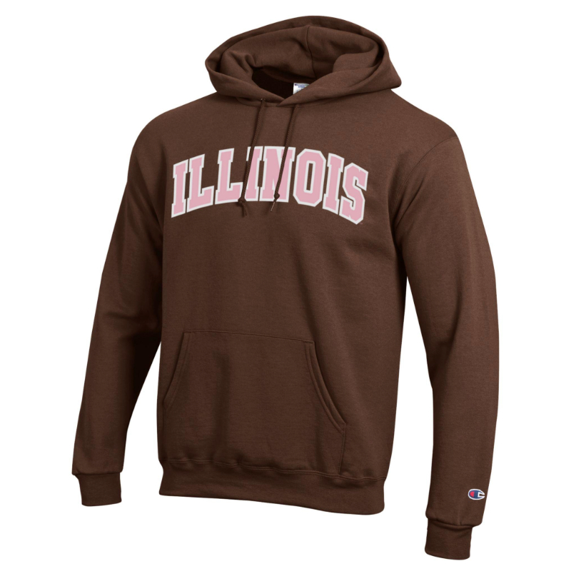 Champion® 50% cotton/50% polyester Illinois brown hoodie with an Illinois arch in pink twill lettering. Stay warm and show your Illini pride with this classic Illinois hooded sweatshirt! Perfect for chilly days on campus or casual outings, this hoodie combines comfort and style.