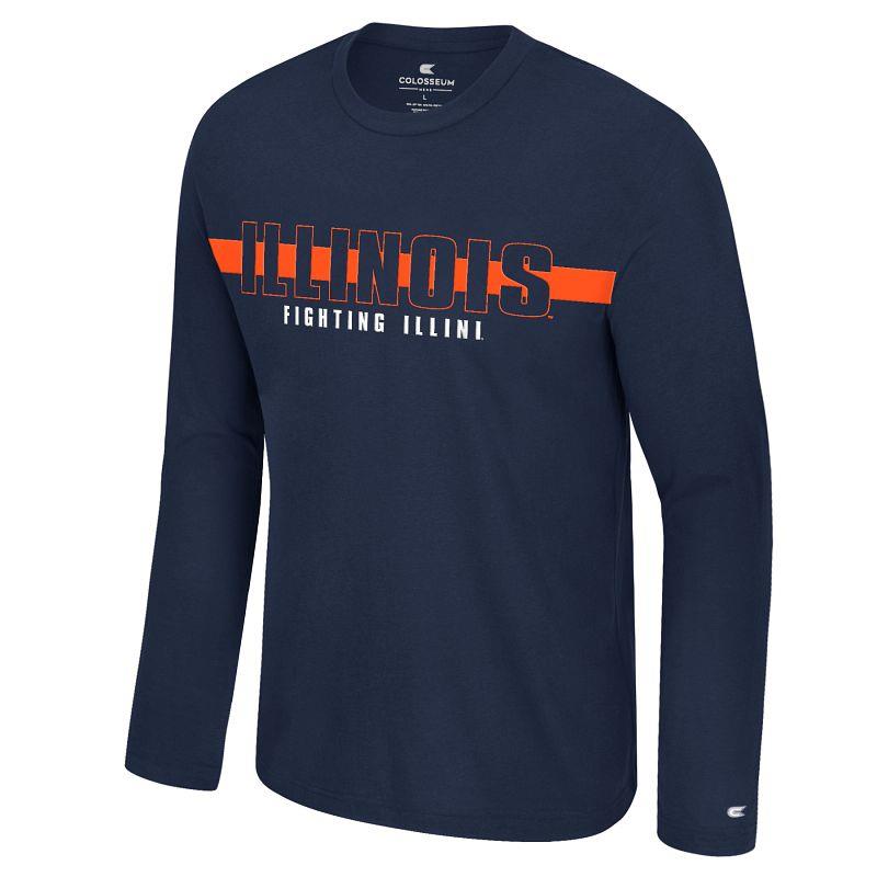 Colosseum® 60% cotton/40% polyester Illinois long sleeve shirt. Features screenrpinted "Illinois" "Fighting Illini" on the front and a Block I on the collar.