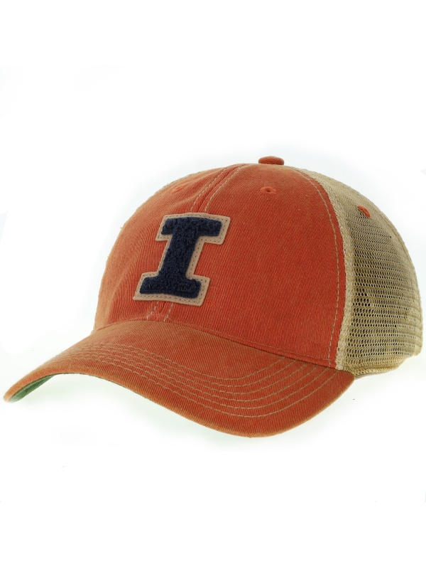 Legacy® Illinois orange snapback trucker cap with chenille Block I patch and mesh back.