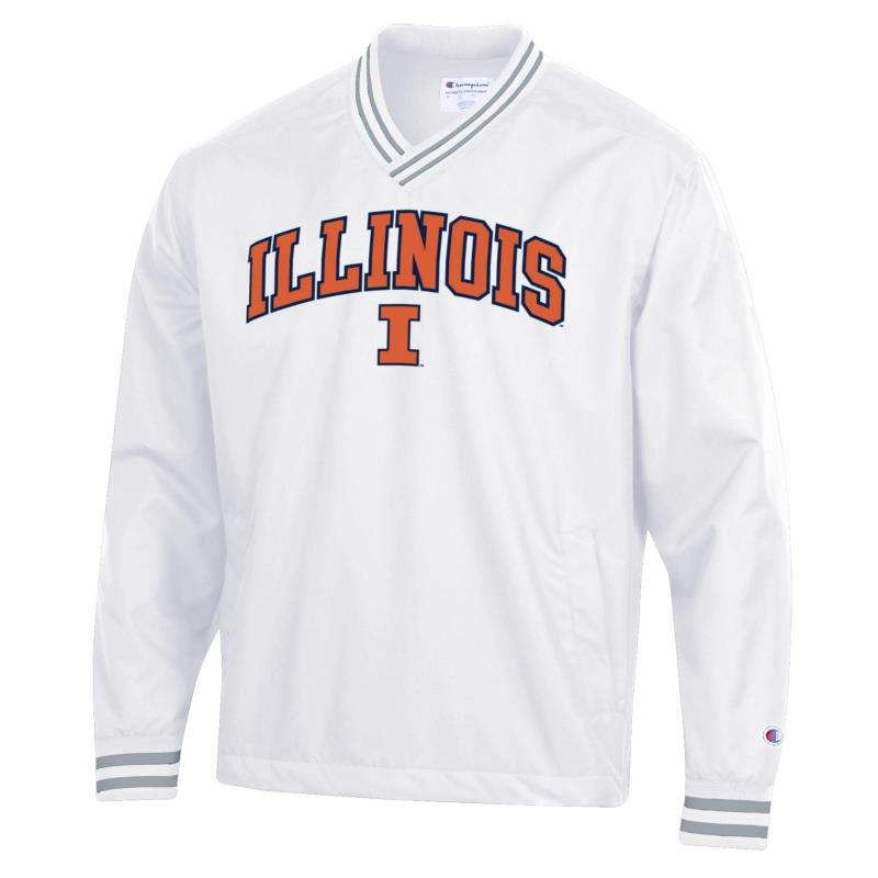Champion® 100% polyester Illinois pullover jacket. Gear up in classic collegiate style with this jacket that features "ILLINOIS" boldly stitched across the chest, complemented by a large orange Block I beneath it—a proud display of school spirit. Designed for comfort and durability, it includes ribbed cuffs and a striped collar for a sporty finish. Whether you're heading to a game or just want to represent your alma mater, this officially licensed Champion jacket is the perfect blend of warmth, style, and pride. (Body lining is 65% polyester/35% cotton | Sleeves and collar are 100% nylon)