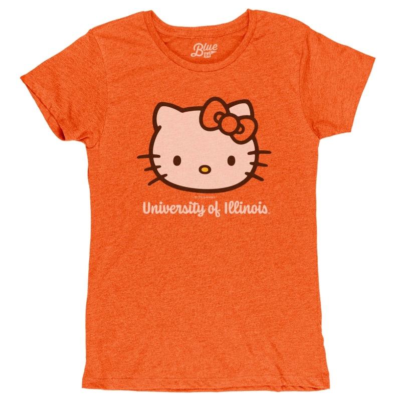 Blue 84® (Navy 52% cotton/48% polyester | Orange 100% cotton) Illinois women's Hello Kitty t-shirt. This officially licensed University of Illinois Hello Kitty T-shirt combines collegiate spirit with iconic charm. Featuring Hello Kitty’s classic face and bow, paired with “University of Illinois” in a stylish script, this tee is perfect for students, alumni, and Hello Kitty fans alike.