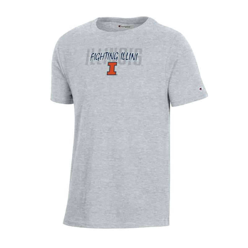 Champion® 90% cotton/10% polyester Illinois kids' t-shirt.This tee features glossy gray screenprinting of ILLINOIS in the background. In front are FIGHTING ILLNI in a regular matte script font and a Block I below. Whether you're on campus, at the stadium, or out and about, this officially licensed Champion t-shirt is your go-to for showcasing team spirit with timeless style.
