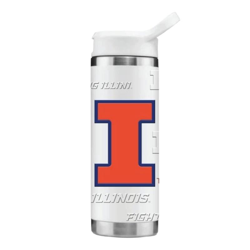 R.F.S.J.® 18oz. Illinois matte water bottle. This stylish and functional hydration solution showcases your pride for the University of Illinois with a Block I logo and a glossy print of smaller Block I logos, "ILLINOIS," and "FIGHTING ILLINI." This durable bottle is designed for both everyday use and athletic activities. Made from high-quality materials, this dishwasher-safe bottle keeps your drinks at the perfect temperature, whether you're at the gym, on campus, or outdoors. With its sleek design and easy-to-use lid, you can stay hydrated in style while representing your favorite school. It’s the perfect accessory for any Illini fan! Don't miss out on the chance to show your school spirit while staying refreshed!