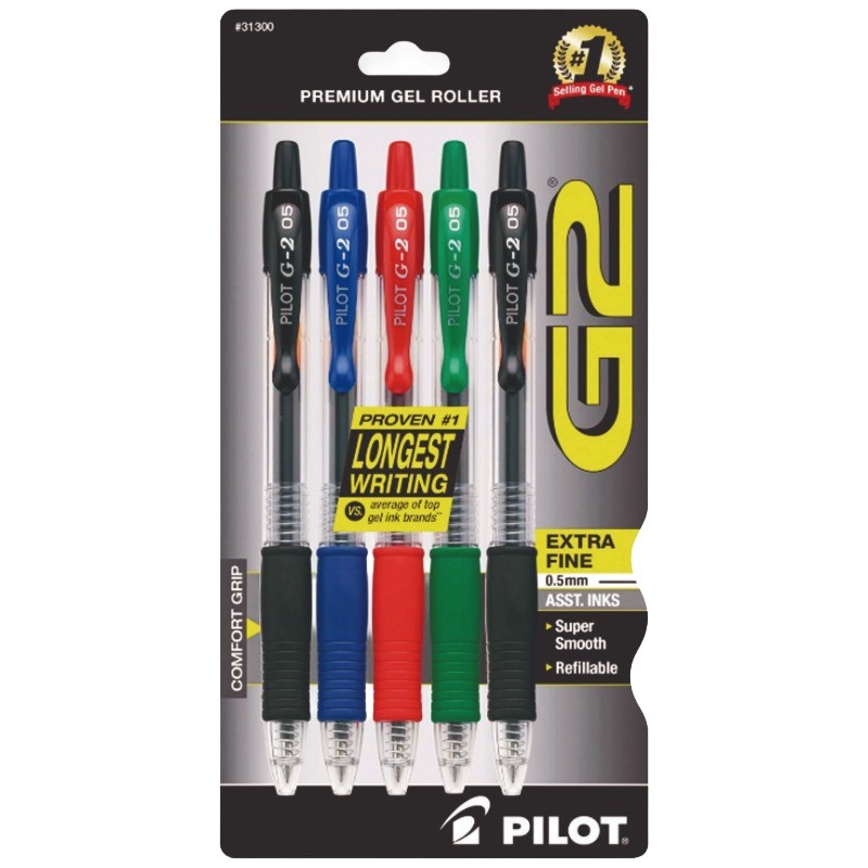 G2® 5-pack of pens (2 black, 1 blue, 1 red, 1 green). G2® pens are some of the longest-lasting and one of America's top-selling gel pens. These premuim pens feature vibrant, quick-drying gel ink to deliver a super-smooth, high-performance writing experience. The translucent barrel allows you to keep an eye on your ink supply, while a contoured, cushioned-rubber grip provides enhanced writing comfort and greater control.