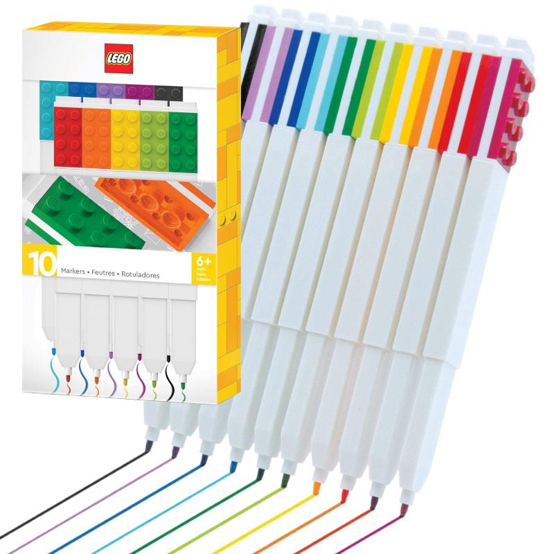 SantokiĀ® 10-pack of LEGO markers. Each marker measures approximately 6.25" long and comes with 2-2x4 genuine LEGO plates imported from Denmark which have been hand glued with precision and placed systematically so you can build on or around them. The unique rectangular design won't roll away from you and the fine marker tip make detailed coloring effortless. Set includes 10 markers, one marker each of violet, red, orange, yellow, lime, green, light blue, blue, lavender & black.