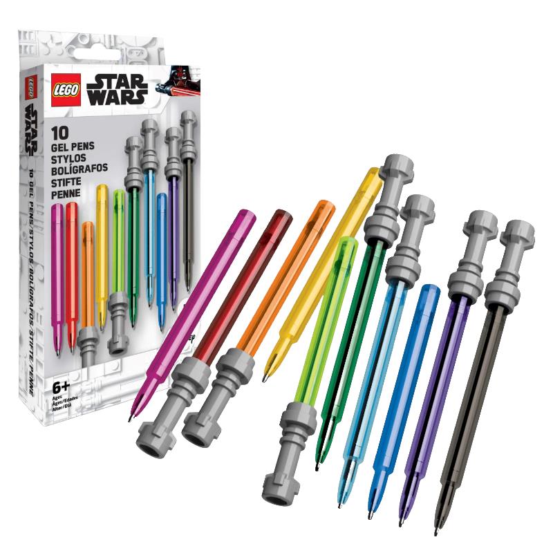 SantokiĀ® 10-pack of LEGO Star Wars gel pens. Official LEGO Star Wars-licensed lightsaber gel pens in Red, Yellow, Green, Blue, Black, Pink, Orange, Lt Blue, Lt Green and Purple. Each pen measures approximately 5.25", with ink colors matching the color of each lightsaber. May the force be with you!