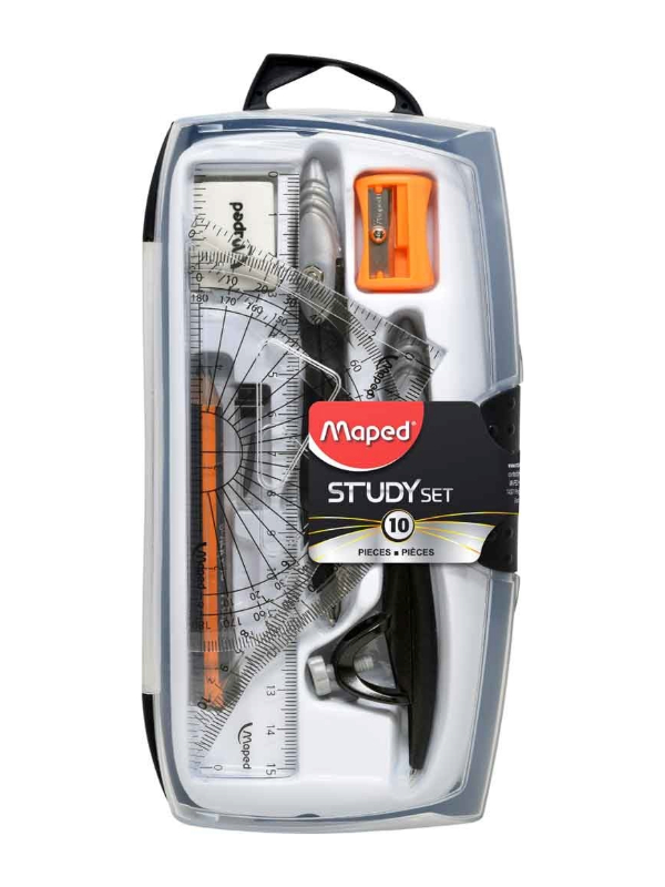 Pens etc ® study set with 2 metal compasses (includes a pencil for the compasses), 6" ruler, 4" protractor, 45° triangle, 60° triangle, extra lead, eraser, and pencil sharpener.